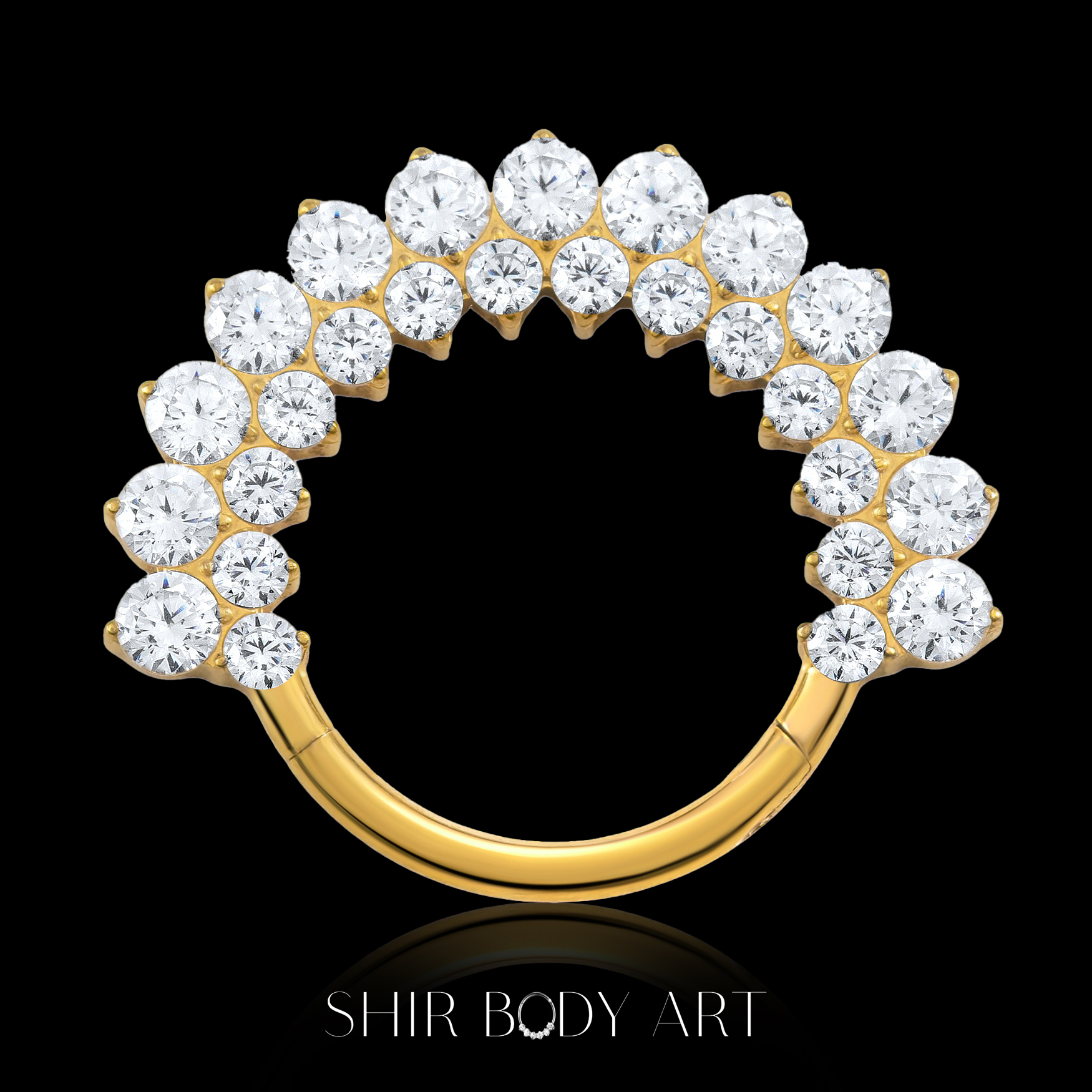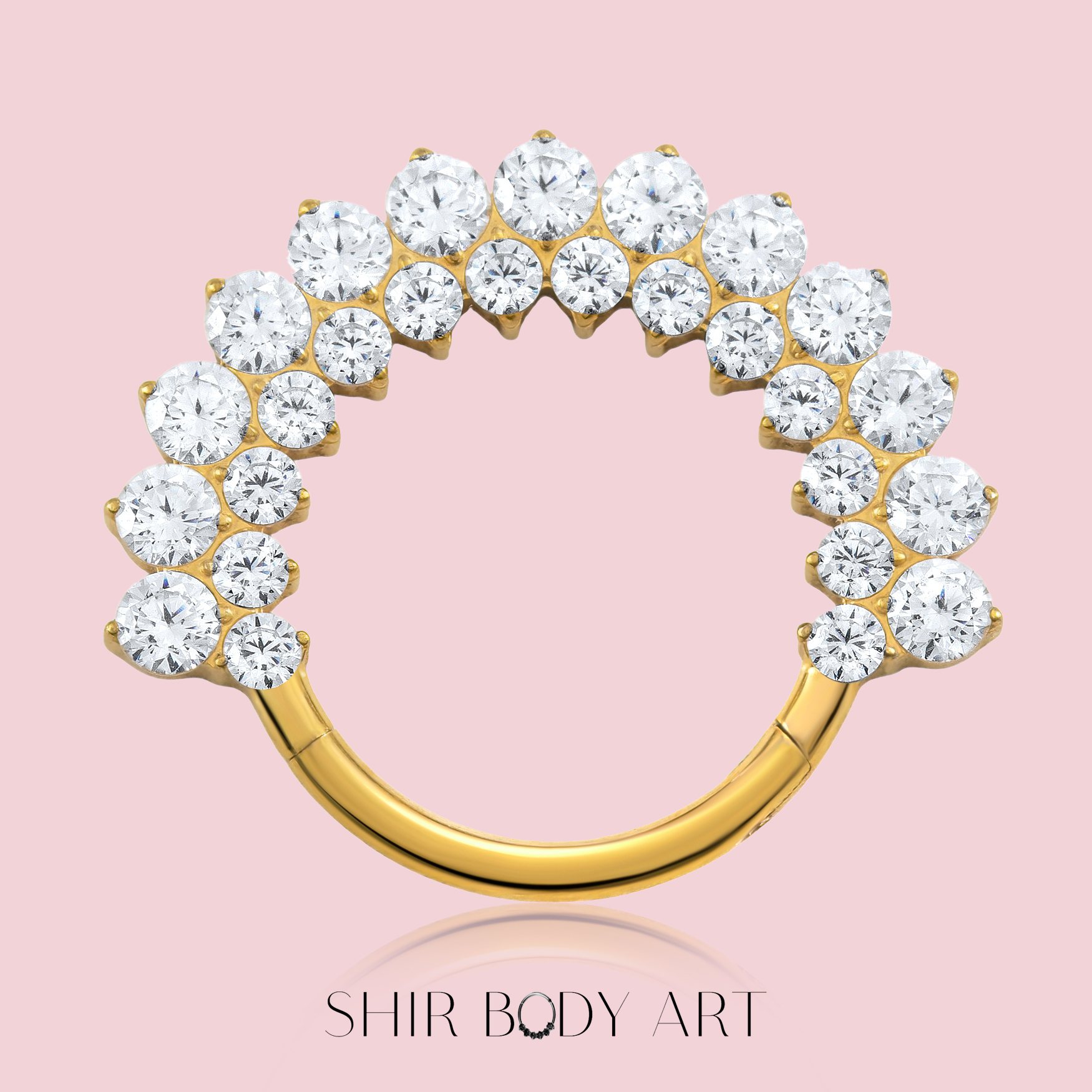 עגיל חישוק מרשים עם זרקונים בשיבוץ צפוף ליצירת אפקט של "הילה" מלכותית.